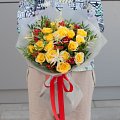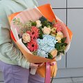 Букет из оранжевых гербер, солидаго, с декоративной зеленью в подарочной упаковке.