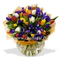 Корзинка из альстромерий "Пастель" (арт. 63-G) Корзинка из разноцветных альстромерий в пастельных тонах с декоративной зеленью.